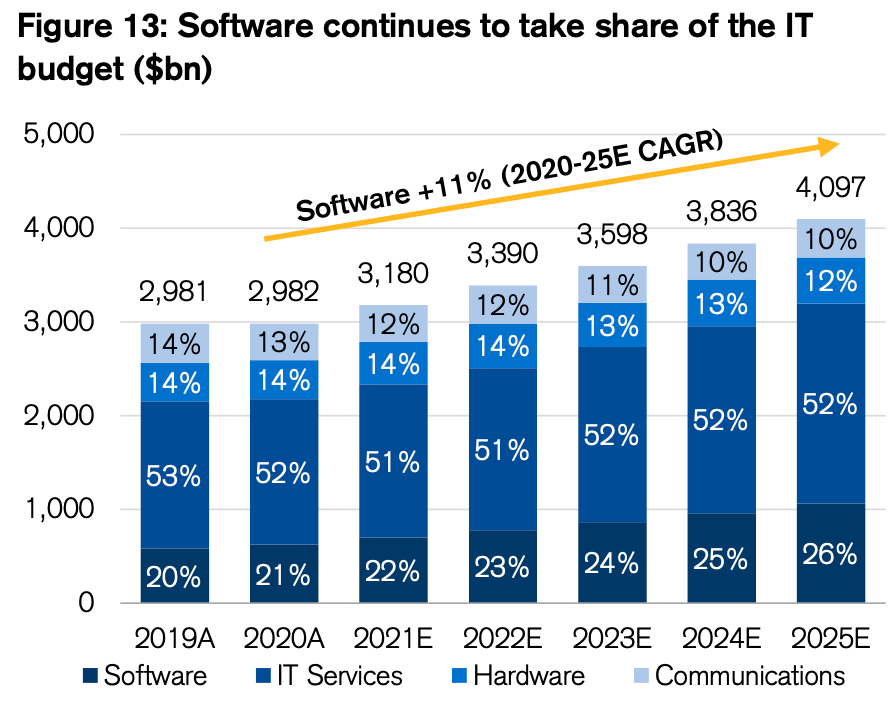This approach precludes one from gauging the true market opportunity. IT spend is often a function of the quality of the existing software solutions, rather than the size of the problem and the budgets allocated towards solving it through labour or other means.